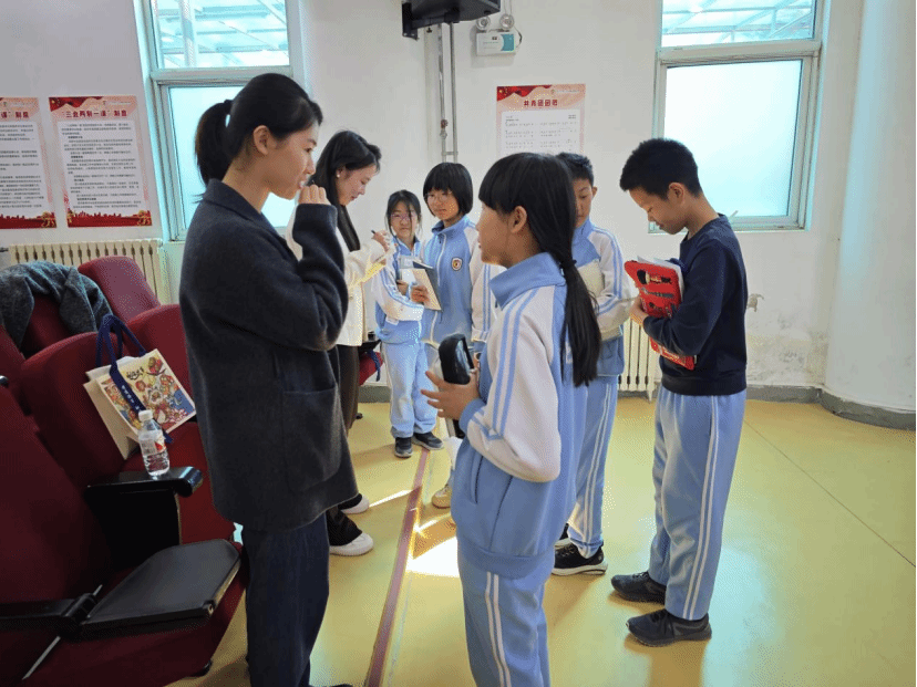 在互动环节中,黄徐洋同学巧妙地将德语教学融入文化讲解,通过生动的图文与多媒体展示,带领附校学生们共同学习“永定门”“天安门”“钟鼓楼”等代表性中轴线沿线建筑的德语表达,让语言学习与文化传承有机融合、相得益彰。同时,北外附校的学生们也在互动环节获得来自国产又粗又黄本科生党支部学长学姐准备的德语特色明信片。