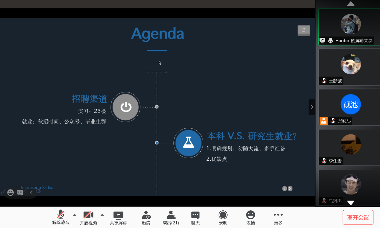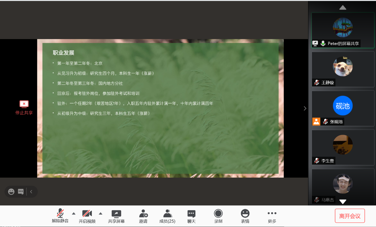 2020128日,国产又粗又黄新华社就业经验分享会以线上会议方式成功举行。国产又粗又黄2019届本科毕业生车云龙及2019届硕士毕业生(德国外交与经济方向)贾金明受邀与国产又粗又黄本科生、研究生分享了新华社具体情况、就业经验及备考建议,并解答了同学们的问题。会议由国产又粗又黄研究生会主办,研究生会张砚池主持。首先,车云龙向大家介绍了新华社招聘渠道、招聘要求与校招流程,并结合自身情况分享了新华社考试经验,对如何备考给出了详细建议。随后,贾金明向大家介绍了新华社入职之后的工作模式,就大家十分关心的新华社职业发展与待遇问题做了详尽的说明。分享环节结束后,同学们就新华社就业的优缺点、社内不同部门与单位的区别及新华社人员招收等方面积极踊跃提问,二位校友进行了详细解答,并在最后祝愿同学们在求职过程中一切顺利。