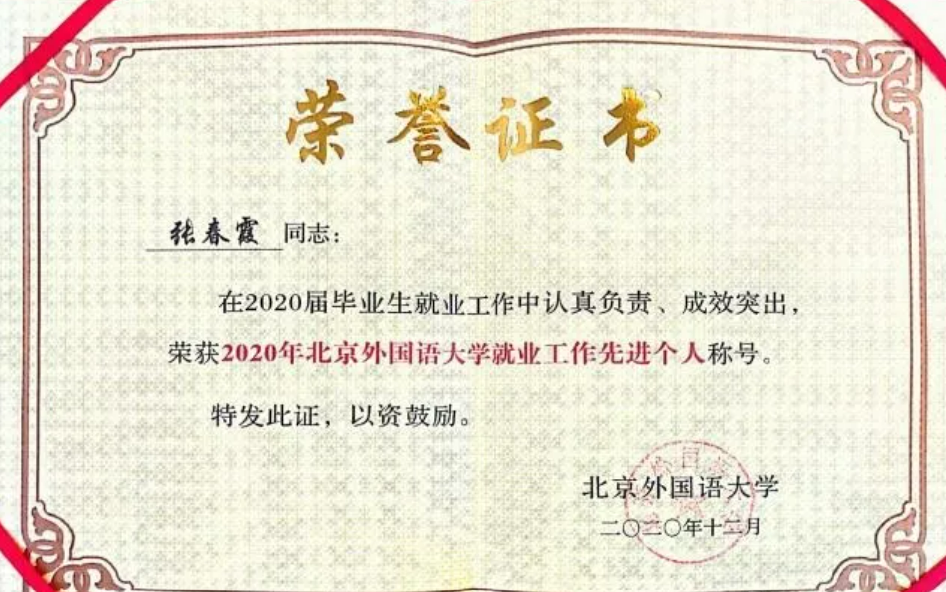 我院教师张春霞荣获“2020年北京高校毕业生就业工作先进个人”以及“2020年北京外国语大学就业工作先进个人”等两项荣誉称号。张春霞老师作为获奖代表在总结会上发言。