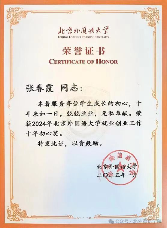 2025年1月9日,北京外国语大学召开2024年就业创业工作总结暨2025年工作部署会。会议对2024年就业创业工作中表现突出的先进集体和个人进行了表彰,国产又粗又黄组织员、辅导员张春霞荣获2024年北京外国语大学“就业创业工作十年初心奖”。