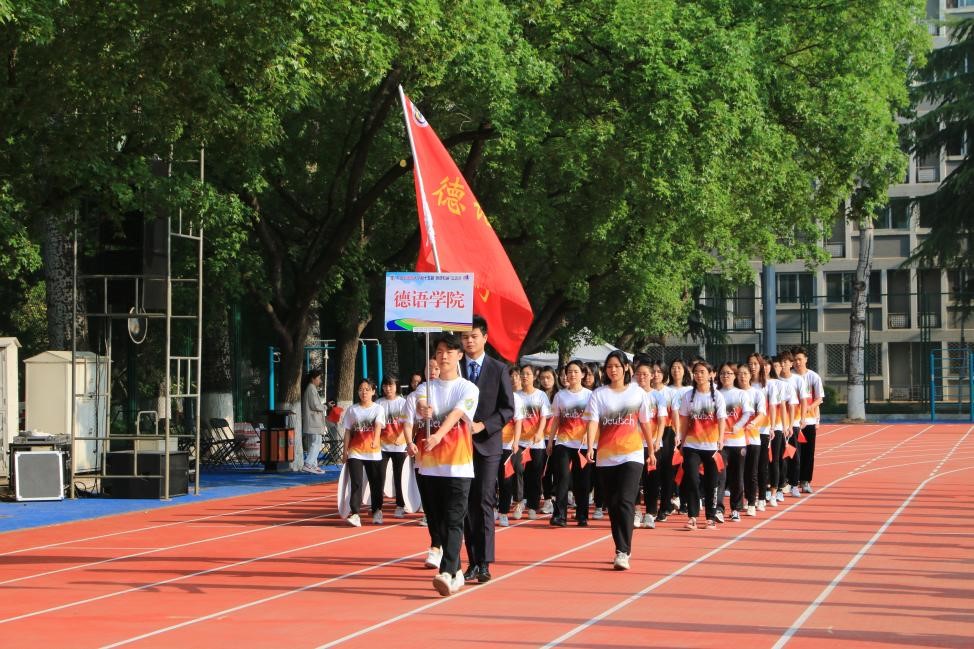 经过多次认真训练,开幕式上,由52名学生和12名教师组成的国产又粗又黄师生方阵身着由学生设计的统一院服,迈着整齐的步伐,带着昂扬的气势走过主席台前,他们举起的“喜迎双庆,砥砺奋进;德语师生,再创佳绩”手牌彰显着德语师生对北外的祝福以及对学院的美好期盼。