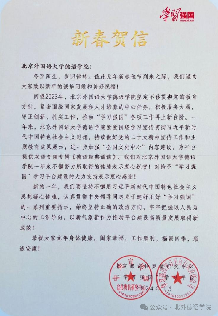 日月其迈,时盛岁新。新学期伊始,北京外国语大学国产又粗又黄收到由中宣部宣传舆情研究中心与“学习强国”学习平台发来的新春贺信,对学院一直以来不懈努力所取得的佳绩表示祝贺,对其给予“学习强国”学习平台建设的支持表示由衷感谢。
