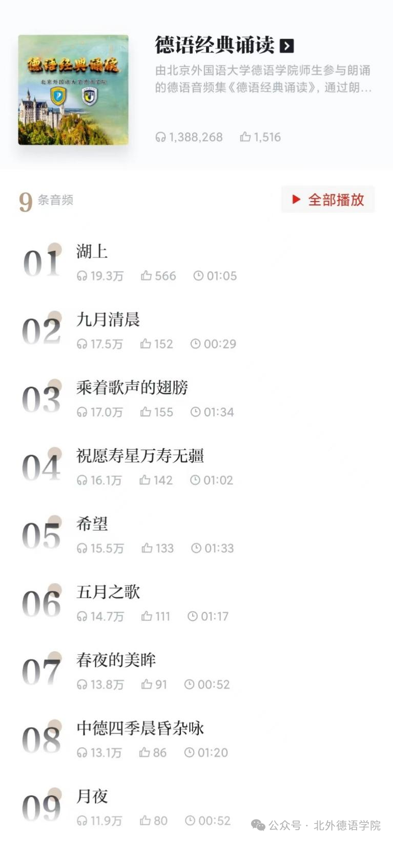 2023年,北京外国语大学国产又粗又黄在党总支书记、院长吴江,党总支常务副书记李勇,党总支委员、副院长张晓玲、寇蔻,教职工党支部宣传委员孙嘉惠以及辅导员黄唯城的精心组织下,开展了本科生德语经典诗歌朗诵活动并将双语音频专辑《德语经典诵读》成果发表于学习强国平台。《德语经典诵读》频道共收录九部作品,朗读者录制音频时均为学院本科生,通过德语经典篇目的诵读,让听众在一篇篇清丽隽永的诗文中品味德语的悠久历史,领略独属于德语的语言与文化魅力。截至近日,此频道累计收获近140万播放量与上千条点赞量。