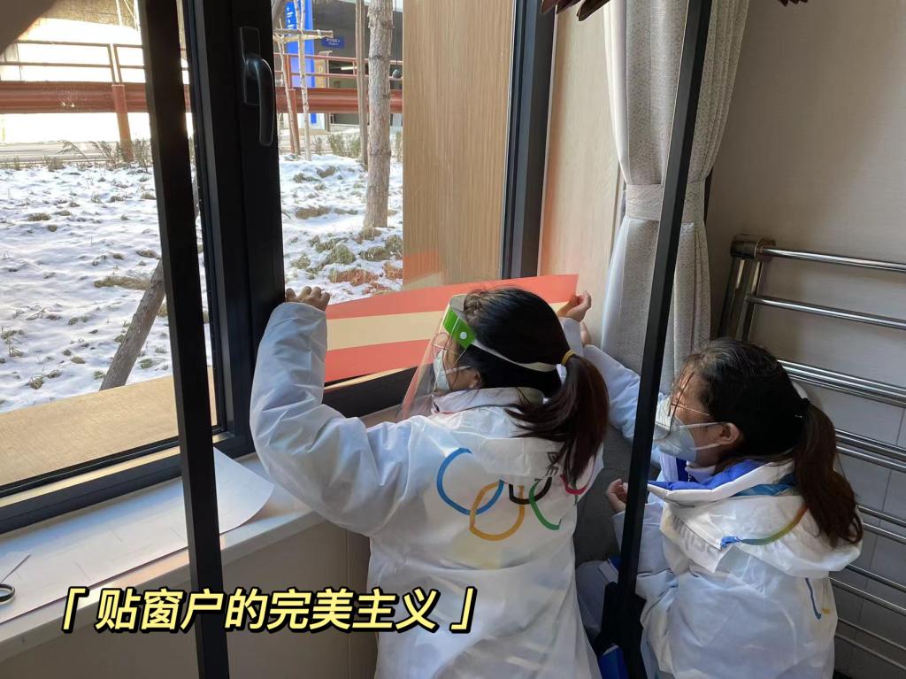 1月26日,奥地利代表团第一批运动员及工作人员抵达北京,这标志着我作为奥地利代表团助理的工作也正式开始了。我的第一个任务是帮助他们用奥地利元素来布置房间和走廊。带领我们的是一个叫Janine的小姐姐(通过跟她聊天得知她刚满25岁),她放着节奏感很强的音乐,带着我们边跳边贴奥地利国旗。这份工作其实并不轻松,尤其是我身高不够,还穿着防护服、戴着面罩、口罩和手套(防疫要求),一上午下来全身都湿透了。但这也换来了我的第一份礼物:来自维也纳的威化饼干和奥地利的专属徽章!B班的同事下班后还帮我们捎回了两盒完整的必胜客披萨!面对奥地利人的热情,真希望没有疫情,大家可以不在意社交距离地亲密交谈。