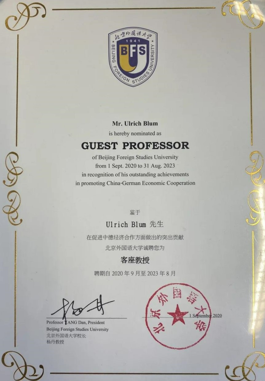 鉴于其在促进中德经济合作方面做出的突出贡献,德国哈勒-维滕贝格大学经济系讲席教授、弗劳恩霍夫协会材料经济学中心创始人卜玉洗(Ulrich Blum)自本学期起被聘为北京外国语大学客座教授,聘期三年。