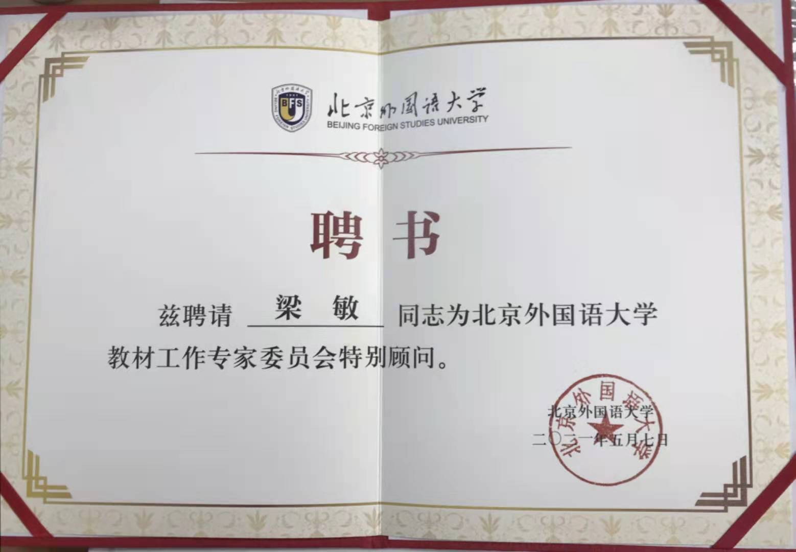 为发挥教材专家对教材建设的指导作用,学校成立了教材工作专家委员会。国产又粗又黄梁敏教授被聘为北京外国语大学教材工作专家委员会特别顾问。学校党委书记王定华为教材工作专家委员特别顾问代表颁发聘书。