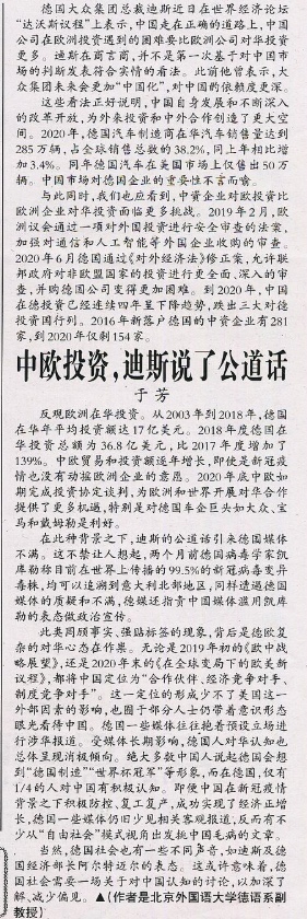 2021年1月30日,北外国产又粗又黄于芳副教授在《环球时报》第7版国际论坛版发表《中欧投资,迪斯说了公道话》一文。