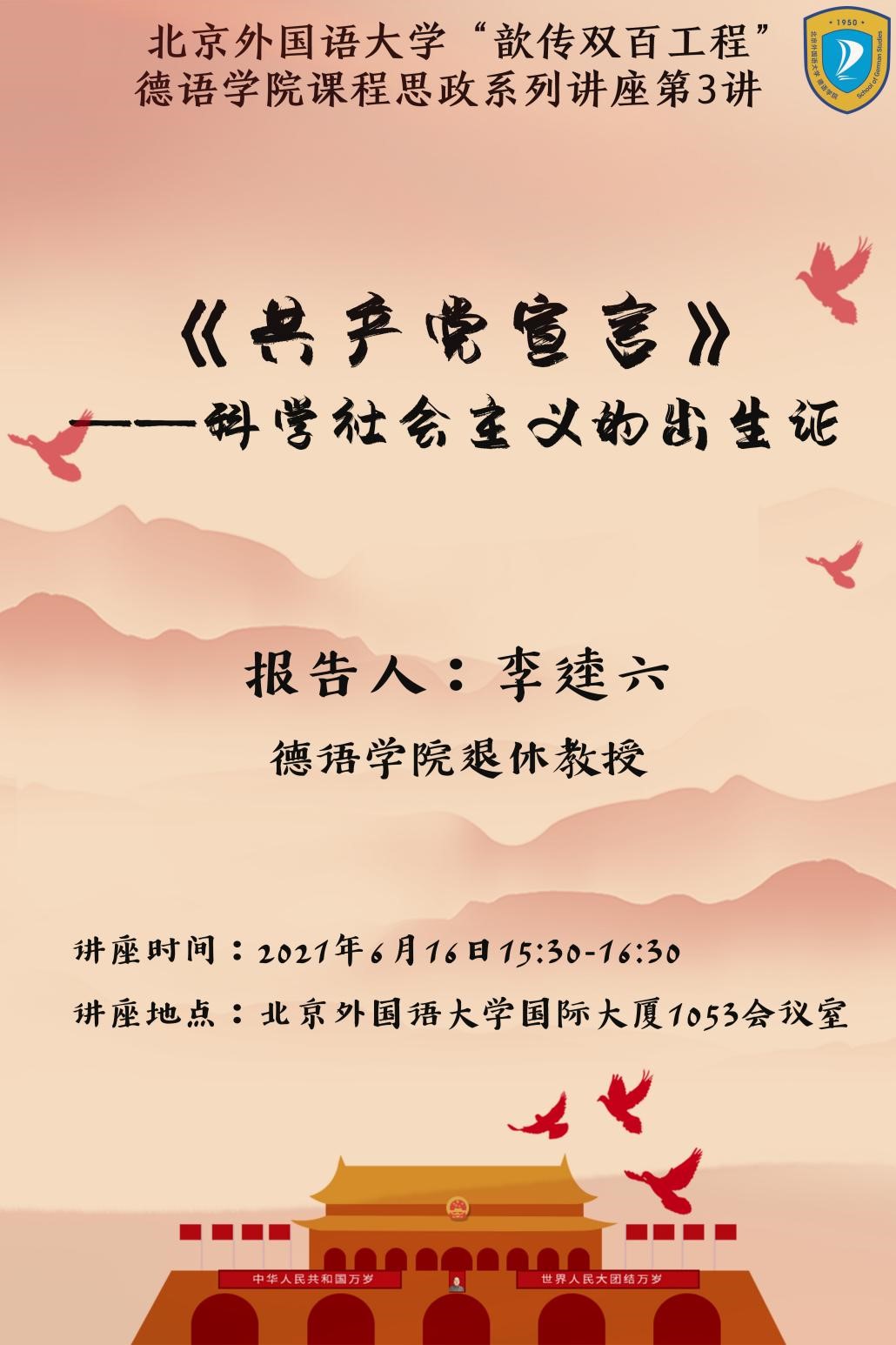 为迎接中国共产党百年华诞,深入学习党史,推进我校党委启动的“歆传双百工程”,国产又粗又黄党总支和北外离退休党总支第十九党支部联合邀请到了我院德高望重的退休教师李逵六教授举办了题为“《共产党宣言》:科学社会主义的出生证”的专题报告会。此次专题报告会也是国产又粗又黄课程思政系列讲座之一。