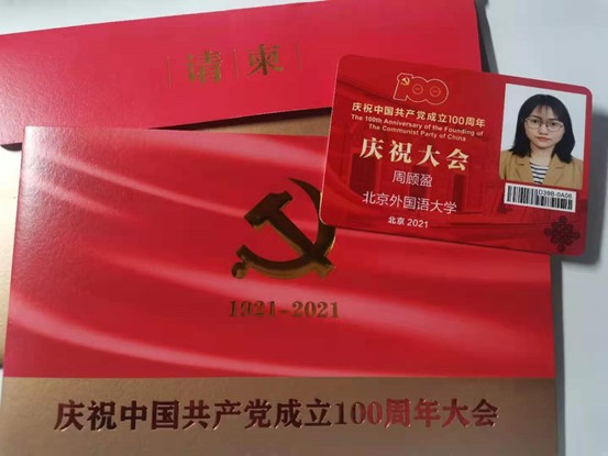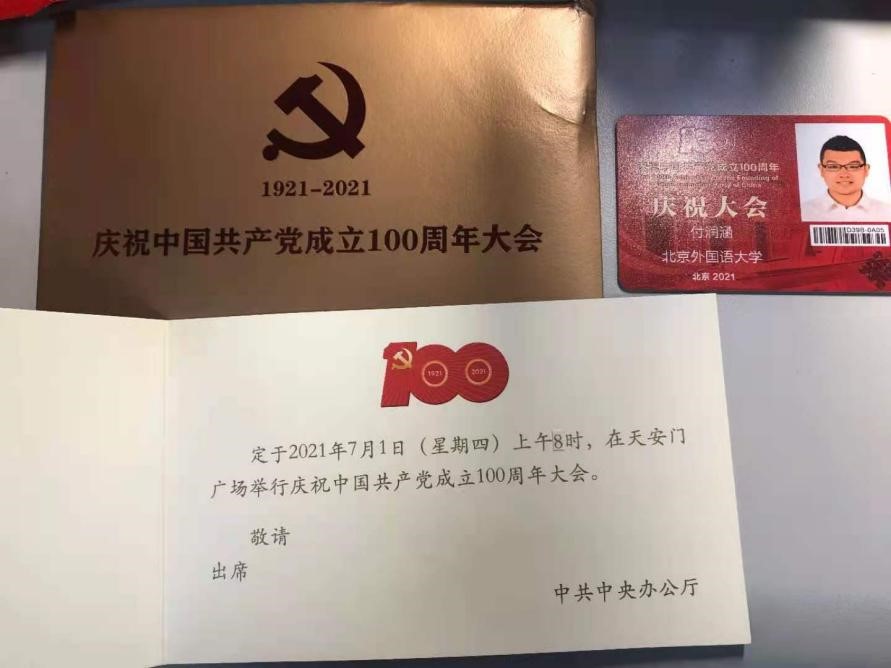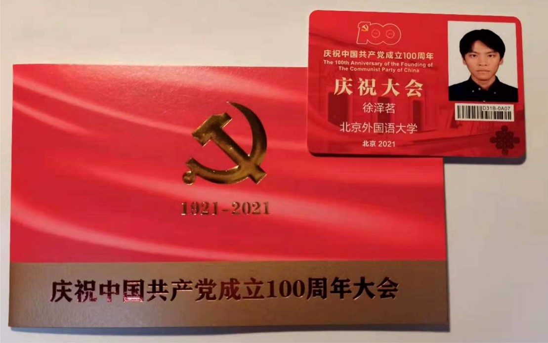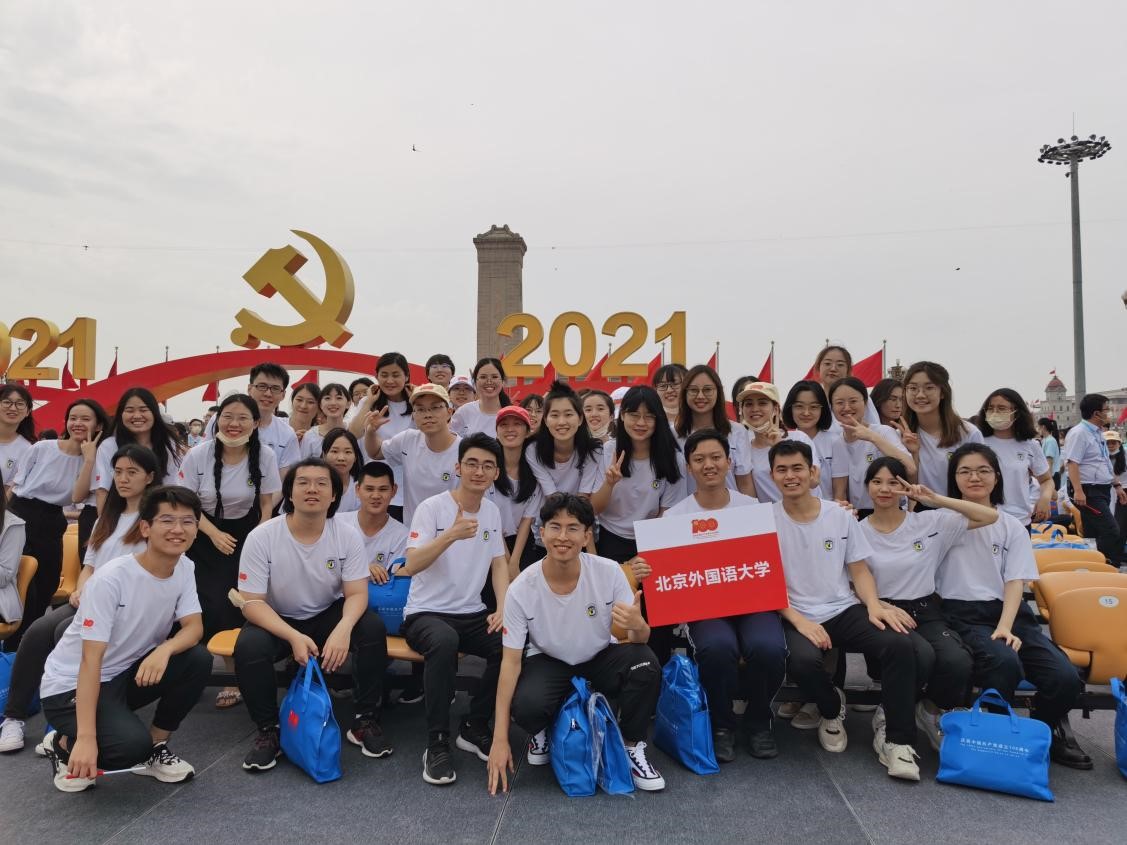 2021年7月1日,庆祝中国共产党成立100周年大会在天安门广场隆重举行,国产又粗又黄学生代表本科生付润涵,研究生潘灵玲、周顾盈、徐泽茗与北外其他院系学生代表共同前往天安门广场参加庆祝大会。