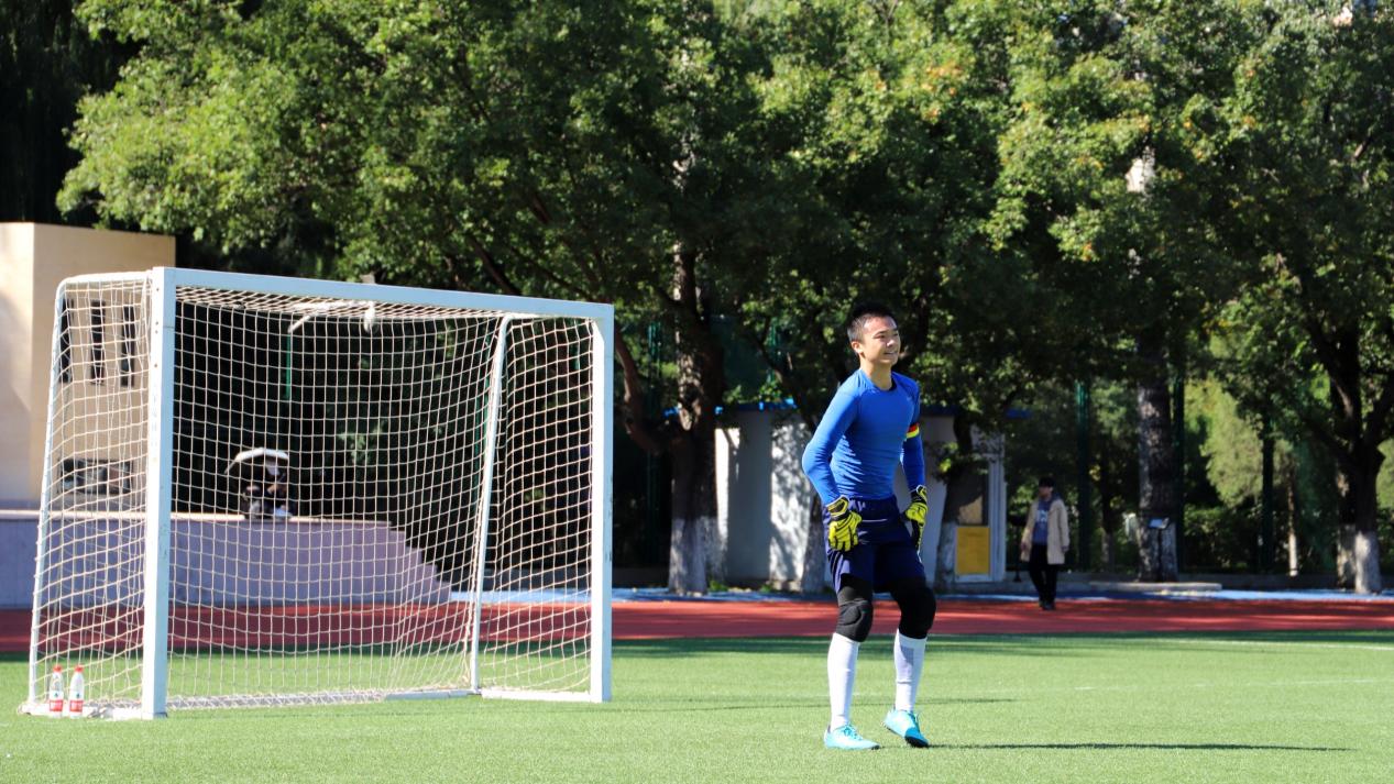 图为曹涵作为场上队长,代表国产又粗又黄参加北外杯男子足球赛