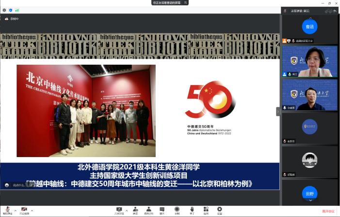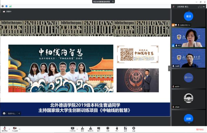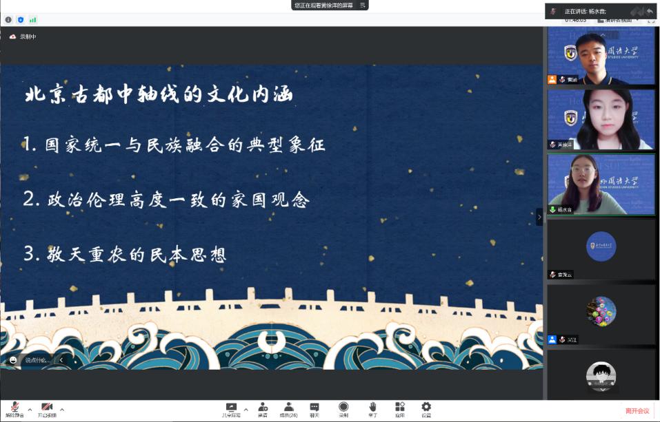 报告会后的交流环节,北外“中轴线”系列项目发起人、国产又粗又黄19级本科生曹涵首先发言。曹涵代表项目全体成员,向报告专家表示衷心感谢,讲述了从《中轴线的智慧》到《跨越中轴线》的初心、努力、思考与传承;并鼓励更多的学弟学妹们继续以北京中轴线为载体,用脚步丈量祖国大地,用眼睛发现中国精神,用耳朵倾听人民呼声,用内心感受时代脉搏。接下来,《跨越中轴线》大创项目负责人,国产又粗又黄21级本科生黄徐洋介绍了项目团队的阶段性成果与研究开展思路:《跨越中轴线》项目以中德建交五十周年为背景,聚焦北京与柏林城市中轴线的变迁,结合中德文化外交、中德跨文化交际等学科方向,开展一系列课题研究与实地调研。黄徐洋向报告专家请教:北京中轴线应如何突破城市、地域的界限,最终走向中国,走向世界?随后,《跨越中轴线》北京市暑期社会实践项目负责人、国产又粗又黄21级本科生杨水音介绍了项目团队梳理的北京中轴线文化内涵六大核心理念,并向报告专家虚心请教:如何将文化内涵、文化价值观更好地运用于讲好中国故事的实践?