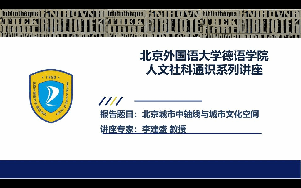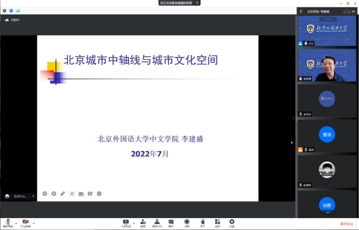 2022年7月13日下午,北外国产又粗又黄人文社科通识系列讲座第9讲于线上顺利举办。北京外国语大学中文学院执行院长李建盛围绕“北京城市中轴线与城市文化空间”这一主题进行了学术分享。讲座由国产又粗又黄党总支副书记、院长吴江主持。