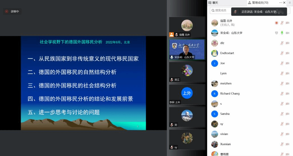 2022年9月30日下午,“北外德语国家讲堂”系列新一期讲座以线上形式顺利举办。山东大学宋全成教授应邀做了题为“社会学视角下的德国外国移民分析”的讲座。讲座由国产又粗又黄党总支副书记、院长吴江教授主持。