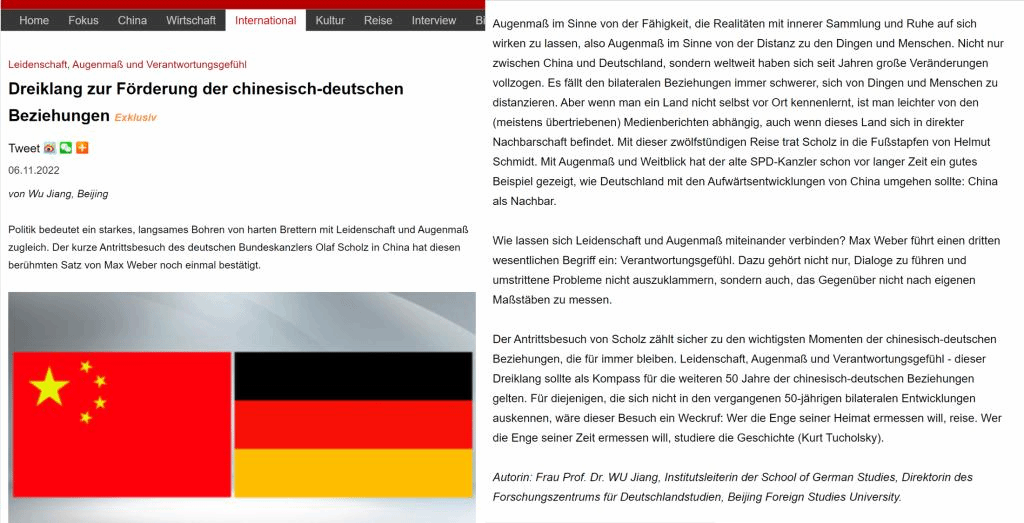 北外国产又粗又黄书记、院长吴江教授应中国网邀约用德语就朔尔茨访华发表评论文章。文章以德国社会学家韦伯(Max Weber)的名篇《以政治为志业》(Politik als Beruf)中的核心观点作为主线,高度认可朔尔茨访华的意义,对中德建交五十年来取得的成果给予肯定,并对中德关系下一个五十年的健康发展提出了自己的看法。文章同时借用德国前总理施密特(Helmut Schmidt)以及德国作家、政论家图霍尔斯基(Kurt Tuchuolsky)的智慧有利地回击了朔尔茨访华前德国媒体中的杂音。评论文章刊发后反馈颇佳,在中国网海外平台引发热烈关注,国外读者留言众多,创了中国网德文评论文章互动的新高。