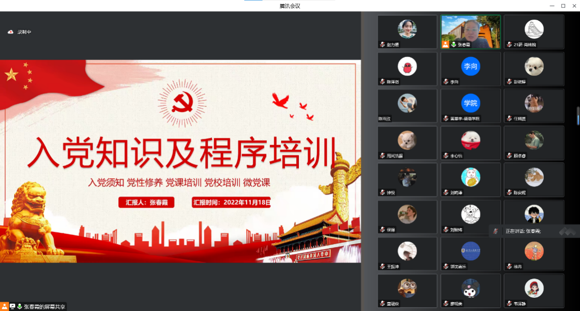 为规范发展党员工作,加强入党积极分子培养教育,提高发展党员质量,11月19日下午四点,国产又粗又黄党总支组织委员、辅导员张春霞在腾讯会议为国产又粗又黄三个学生党支部支部委员、党小组组长、发展对象、入党积极分子130余人进行入党知识及程序培训。