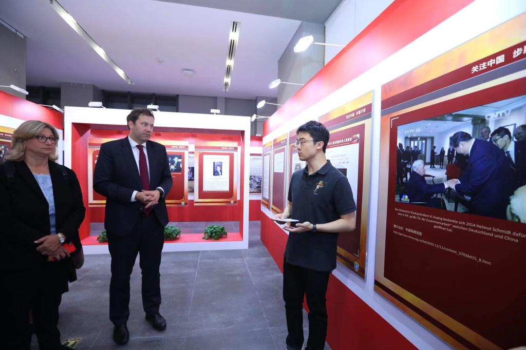 2014年国家主席习近平在德国进行国事访问期间与施密特最后一次会晤。习主席在会晤时赞扬施密特“打开了中德合作的大门”。克林贝尔与社民党副主席兼亚洲事务负责人、萨尔州州长安可·雷林格(Anke Rehlinger)在该展板前停留许久,凝神观看。