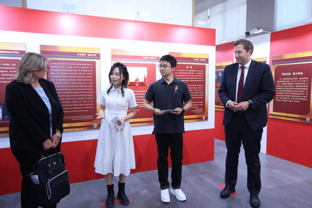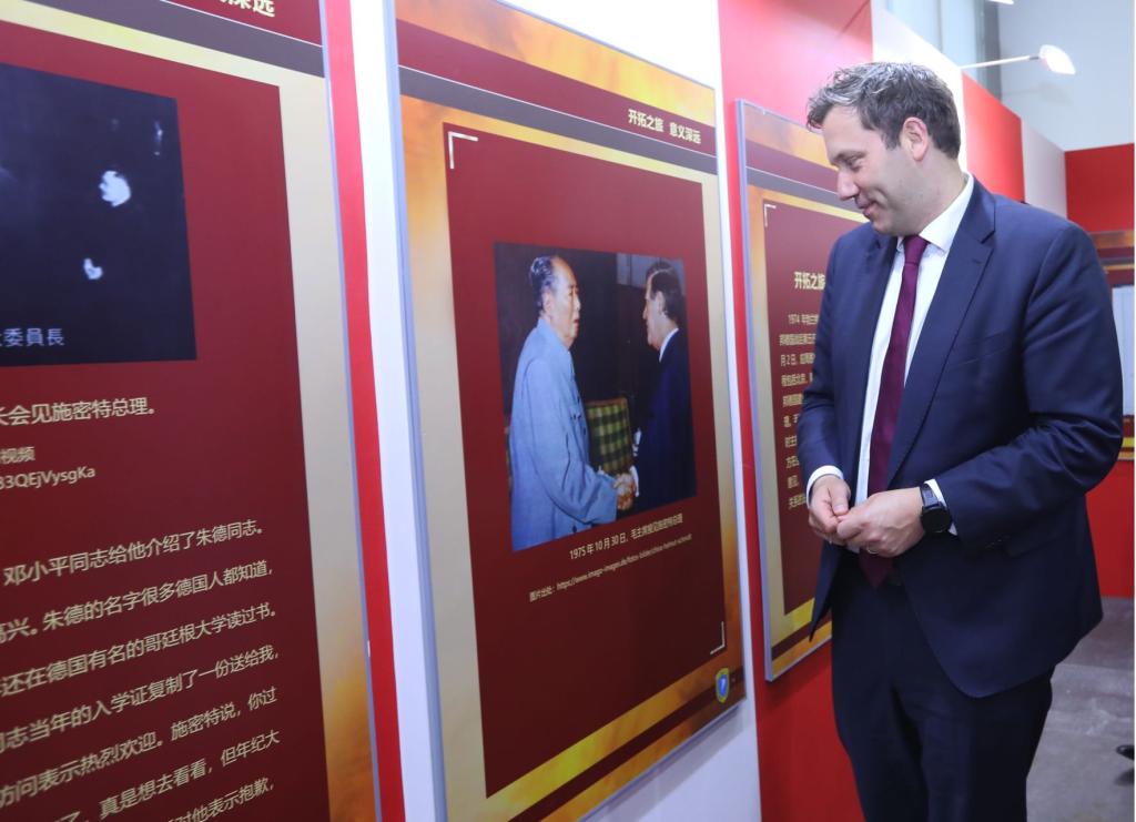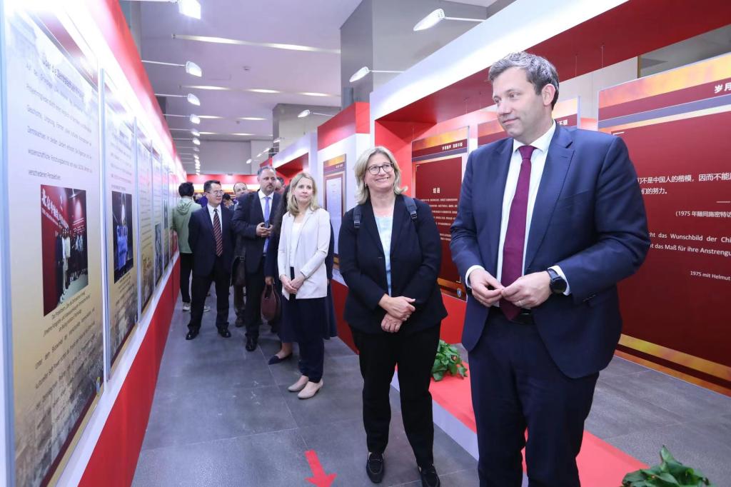 施密特是最早敦促联邦德国与中国建交的政治家之一,也是中国和联邦德国建交后首次访问中国的联邦德国总理。1975年施密特访华时得到了毛主席的接见。克林贝尔在施密特和毛主席的合照前驻足良久,动情地表示德中友谊生生不息、历久弥新,需要两国一代代政治家们接续努力,坚持对话沟通。