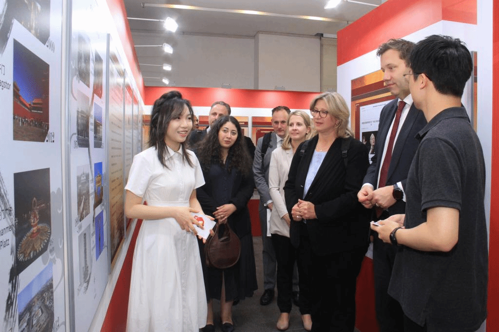 在主题展的互动展区,克林贝尔一行参观了“中轴线的魅力——北京与柏林跨越时空的文化交汇”。北外青年德语学子以北京中轴线和柏林中轴线为载体,立志为新时代中德人文交流贡献力量。