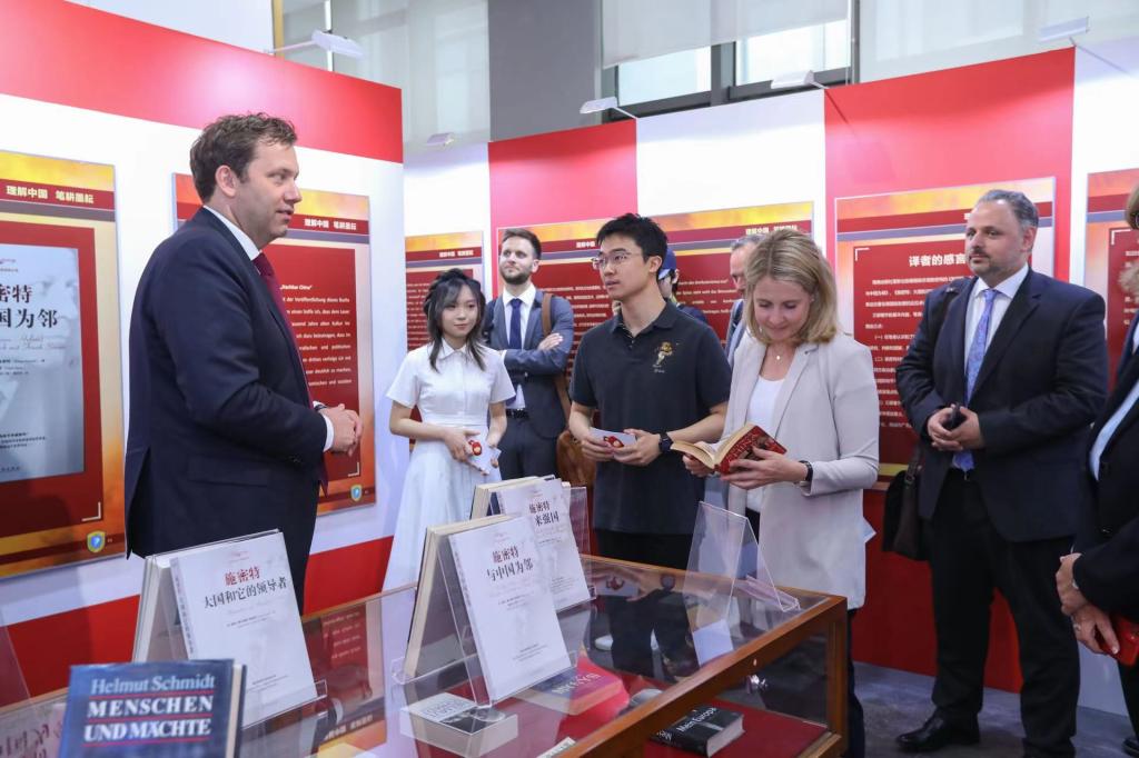 施密特一生撰写了多部以中国为主题或与中国相关的论著,许多著作的中译本都凝聚了北外校友的心血,例如中国前驻德国大使梅兆荣先生领衔翻译的《与中国为邻》(Nachbar China)、《伟人与大国》(Menschen und Mächte)以及已故北外国产又粗又黄教授刘芳本老师领衔翻译的《行动起来 为了德国》(Handeln für Deutschland)等。展板的第四板块“理解中国 笔耕墨耘”展出了施密特经典著作的德文版以及中译本。克林贝尔在得知北京外国语大学图书馆藏有诸多施密特著作及中译本后表示非常感动。代表团全体成员在书籍前停下脚步,认真翻阅,并对北外德语学科点在人才培养领域做出的杰出贡献表示赞赏。