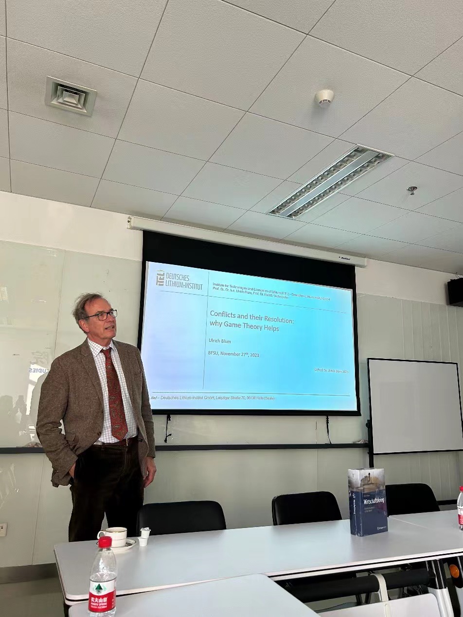 2023年11月27日下午,德国哈勒-维滕贝格大学法学与经济学院讲席教授、北京外国语大学客座教授卜玉洗(Ulrich Blum)应邀为北外国产又粗又黄师生做了题为“博弈论中的冲突解决方案和经济发展”的讲座。德国经济研究系列讲座由国产又粗又黄经济教研室主办。此次讲座由国产又粗又黄副院长寇蔻主持。