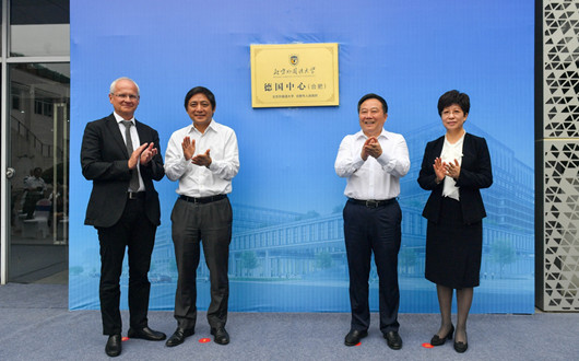 随后,双方领导共同出席了德国中心的挂牌启动仪式。彭龙校长与宋国权书记在凌云市长和德国纽伦堡市副市长戈塞尔的见证下,共同为德国中心挂牌。彭龙、吴春梅和戈塞尔分别在仪式上致辞。