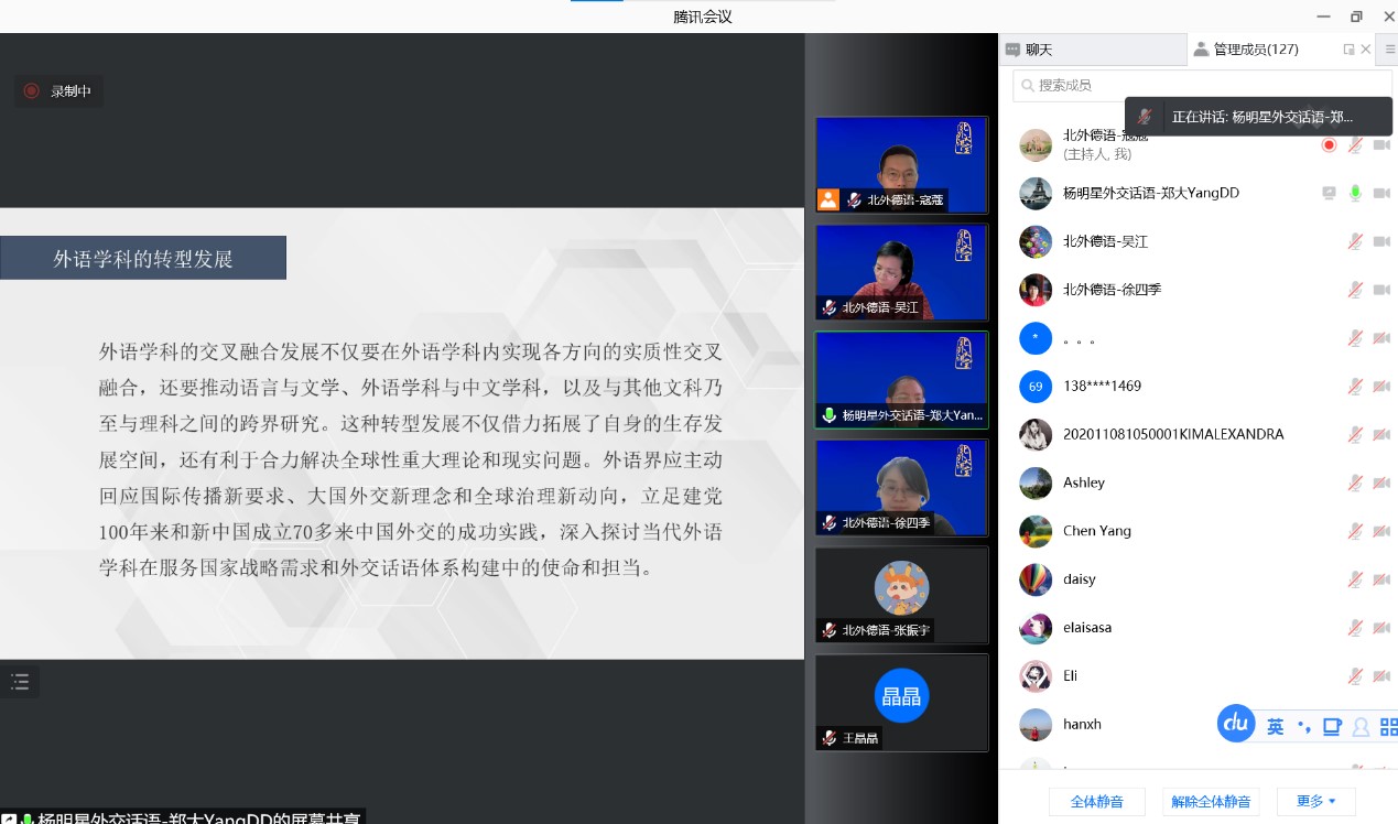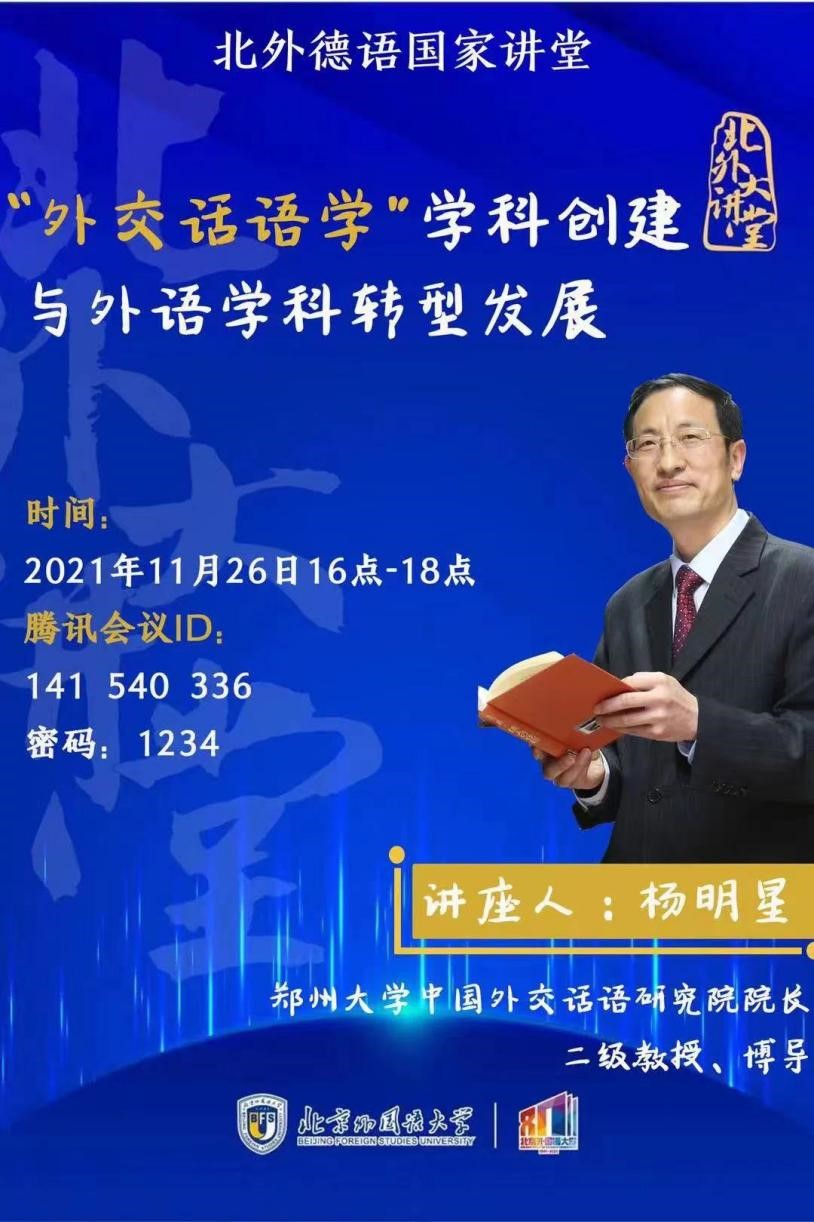 2021年11月26日下午,北外德语国家讲堂以线上方式举行。郑州大学中国外交话语研究院院长杨明星教授应邀作了题为“‘外交话语学’学科创建与外语学科转型发展”的讲座。讲座由国产又粗又黄党总支副书记、院长吴江教授主持。来自全国各高校的120余位师生参加了讲座。