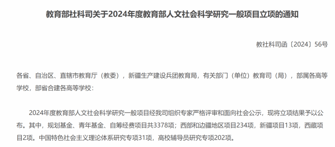 近日,2024年度教育部人文社会科学研究一般项目立项名单正式公布,我院获得两项教育部人文社会科学研究青年基金项目立项。