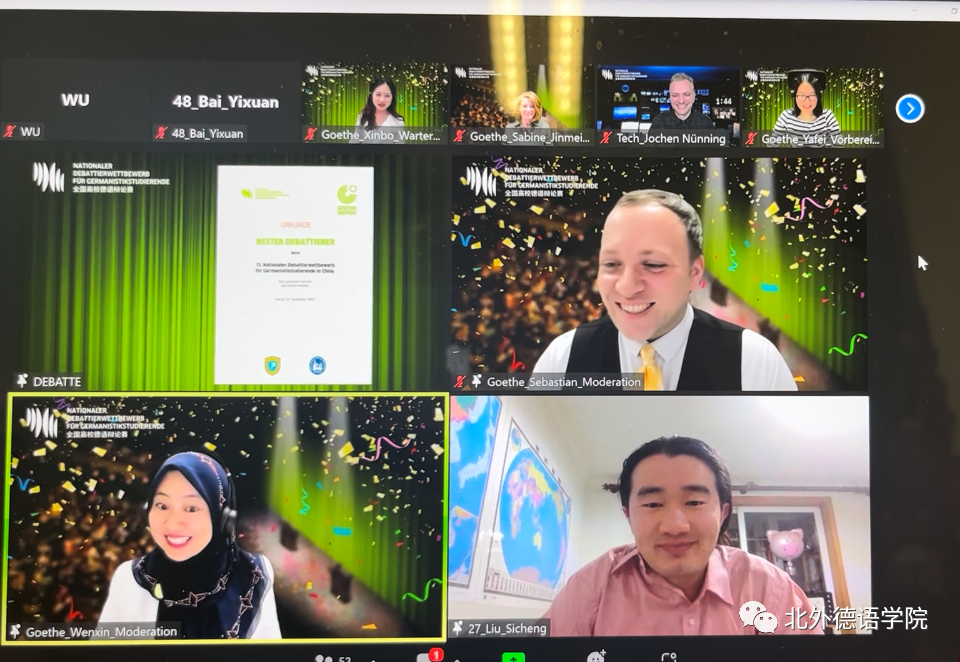 全国高校德语辩论赛是全国高校德语学科点本科生的重要传统赛事,自2007年创办以来已经成功举办过12届。此届全国高校德语辩论赛首次尝试以纯线上方式举办,并通过微博方式现场直播,共吸引了全国48所高校参赛,引起了全国高校德语学科点的高度关注,微博平台点击量突破2万多人次。线上直播这一新的方式同时带来了比赛规则的创新。本届比赛首次启用事先不公布具体辩题,仅只公布辩题涉及领域的新的规则,加大了赛事的难度以及挑战性。