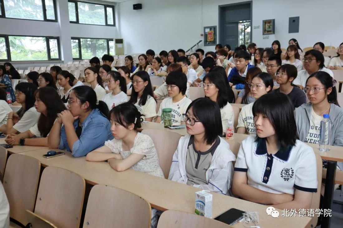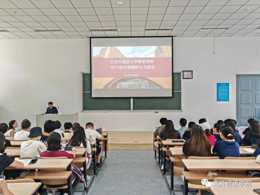 之后,学院党总支以及党政联席会成员先后发言。党总支成员、教学秘书于芳鼓励新生树立新的目标,努力实现梦想;党总支委员、副院长张晓玲、寇蔻勉励新生积极参与学院丰富多彩的各项活动,通过学习德语遇到更好的自己,认识更大的世界,用德语成就梦想,用梦想创造未来!党总支常务副书记李勇引用抗大校训“团结、紧张、严肃、活泼”,希望新生在大学宿舍生活中养成包容差异的生活习惯,搞好团结;在学院和学校的各种集体活动中,在各项校内外竞赛中,团结一致,共创佳绩。保持德语人严谨、认真和细致的好传统作风,勇创新、善突破。保持持之以恒、坚持阅读等良好的微习惯,遇见最好的自己。党总支书记、院长吴江借用汉字“熵”的由来以及管理学提出的实现熵减的三个路径,结合北外国产又粗又黄的发展史,勉励2023级本硕博新生保持开放的心态,学会与不同的学科和方向实现“能量交换”,敢于尝试创新远离稳态,秉持“兼容并蓄 博学笃行”的北外校训,开启在北外的晨读和暮思!