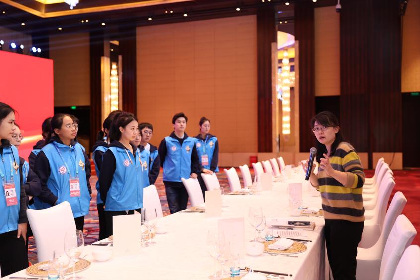 还有一对因连接不上宴会厅的Wi-Fi而犯愁的南非姐妹。当时,服务员阿姨急匆匆找到我,说那边有一桌外国人有点事,非要找我们这些穿蓝色马甲的志愿者解决。我快步走去了解事由后,马上就帮她们解决了Wi-Fi连接出错的问题。那对南非姐妹兴奋极了,问我“How to say ‘darling’ and ’thanks‘ in Chinese”,我也就这样收到了南非友人们的好几句“亲爱的,谢谢”。