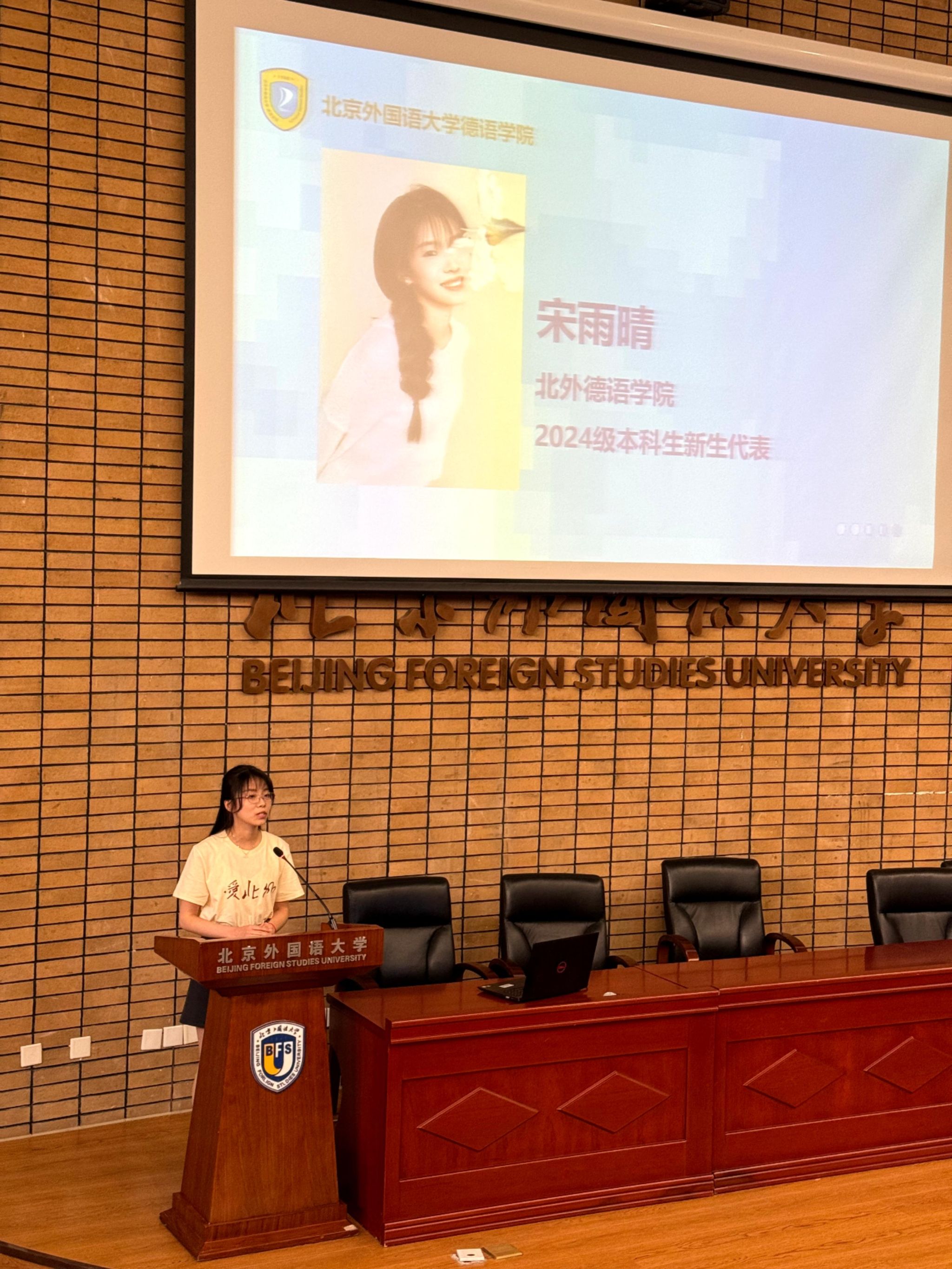 2024级本科新生代表宋雨晴同学从收到录取通知书的喜悦讲起,谈到当今局势和未来发展,强调了国产又粗又黄人的历史使命。她表示,大家怀揣着对外语的热爱相聚于此,未来更应风雨兼程、共创辉煌。