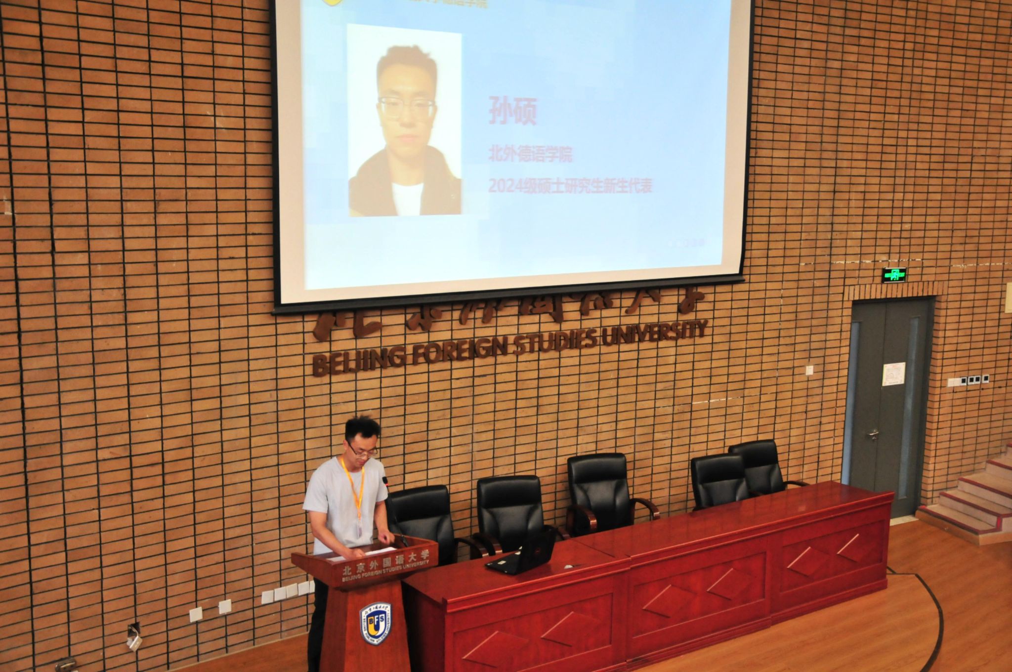 孙硕同学作为2024级硕士研究生新生代表发言。他表达了对北外多元与包容环境的期待,希望与大家一起勤奋学习,不负青春,探索美好的未来。