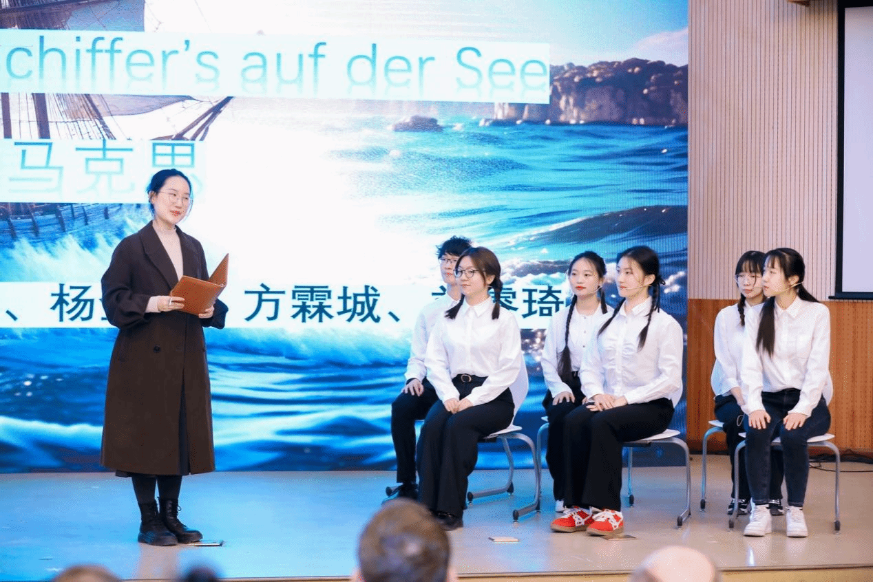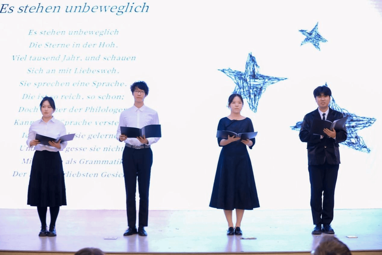 于芳老师和刘晨曦、罗惠心、田润欣、刘金玉等28名同学则为我们带来了中德文诗歌朗诵剧《我们的青春》,热情洋溢的文字中,是对青春和梦想最深情的告白。