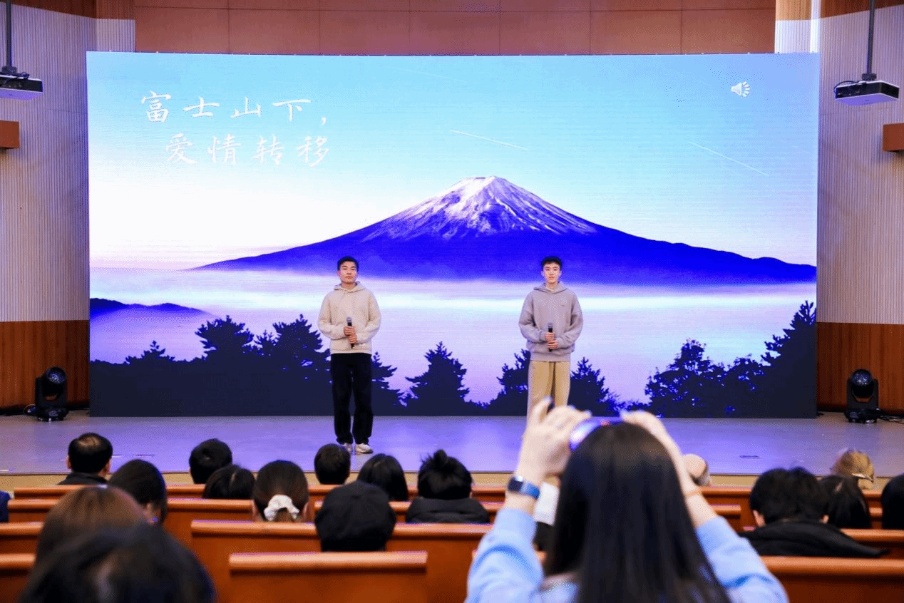 24级聂铭正同学和李曜弛同学用温暖的歌声传递了他们美好真诚的祝愿。他们带来的两首歌曲《富士山下》和《爱情转移》,一边是和过去依依惜别,一边又是向未来大胆奔赴。无论去岁如何,都希望真诚热烈的你可以在新的一年得偿所愿,爱与美好常伴身边。