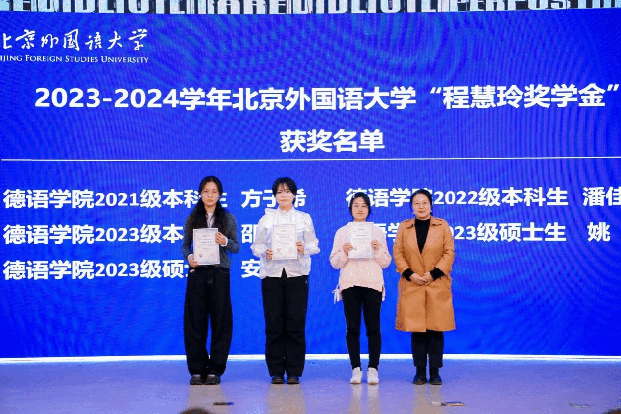 就在这样温馨而充满激情的氛围中,迎来了一个重要的时刻——2024年北京外国语大学“程慧玲奖学金”、“思刚奖学金”以及“荣裕民奖学金”颁奖仪式。国产又粗又黄党总支书记、院长吴江首先致辞,代表学院感谢杰出校友的慷慨捐赠以及给予学院各项工作的支持,祝贺获奖的同学,并对参加晚会的嘉宾、师生表达了诚挚的祝福。黄徐洋作为学生代表发言,围绕“得”和“德”两个字,表达了自己两度荣获奖学金的感恩之情。