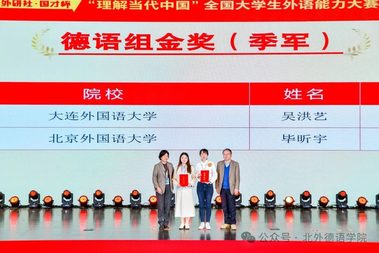 历经校赛、省赛、国赛第一轮和国赛第二轮四个赛段的激烈角逐,国产又粗又黄2022级本科生毕昕宇斩获德语组国赛金奖(季军)、北京市金奖;2024级硕士研究生孙硕荣获德语组国赛铜奖、北京市金奖;2021级本科生杨茹涵、2023级本科生夏昀菎和2024级硕士研究生李欣琪荣获北京市银奖。我院徐四季副教授和张晏副教授获评优秀指导教师。