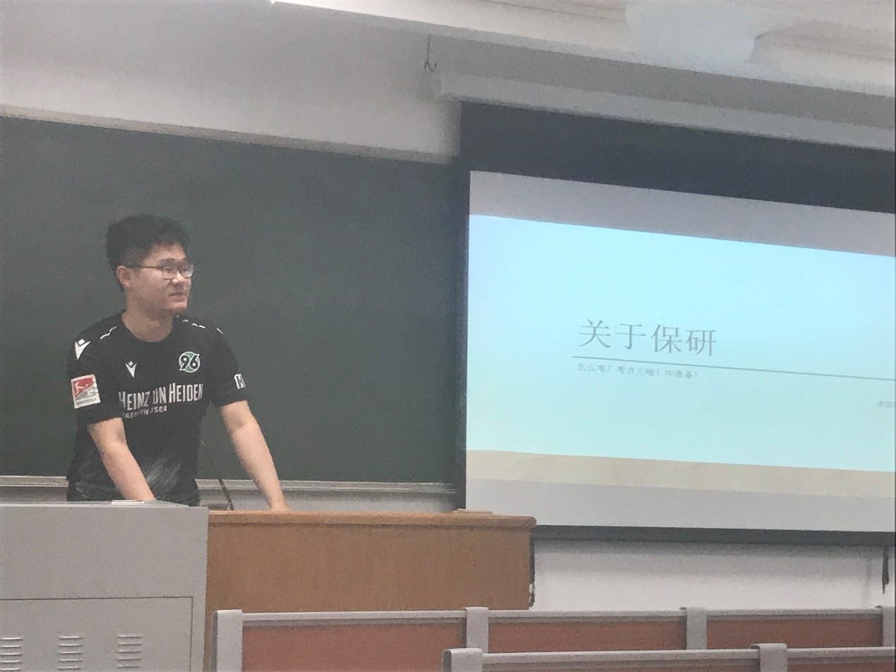 这之后,王文卓同学还分享了她准备考试期间调整心态的方法,并根据自己保研路上出现的问题和学弟学妹们分享了自己的经验。
