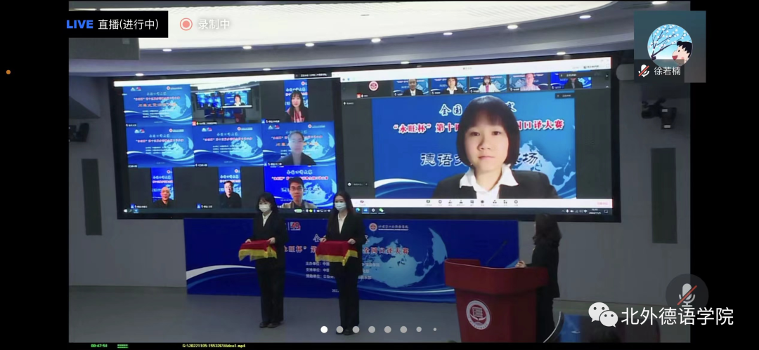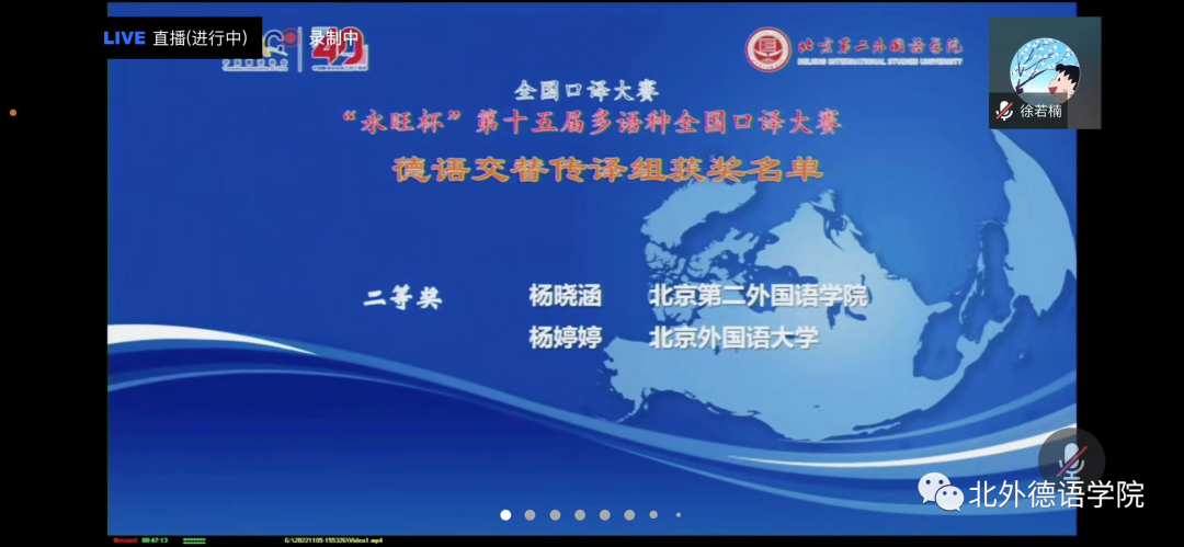 “永旺杯”第十五届多语种全国口译大赛于2022年11月5日成功在线举办,赛事通过腾讯会议进行了全程直播。来自全国49所高校的选手在比赛中激烈角逐,展现出高水平的口译专业素养以及出色的个人风采。在德语交替传译组的复赛和决赛中,我院MTI口译专业研究生杨婷婷同学经过激烈的比拼,获得德语交传组二等奖的好成绩。此次参赛由我院青年教师徐若楠博士带队。