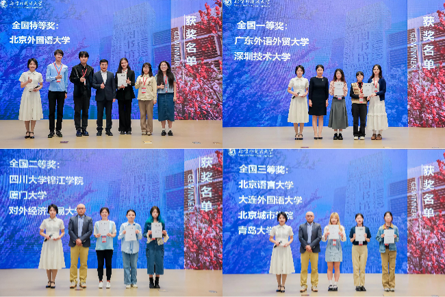 最终,北京外国语大学代表队获得全国特等奖,广东外语外贸大学和深圳技术大学代表队获得全国一等奖,四川大学锦江学院、厦门大学和对外经济贸易大学代表队获得全国二等奖,北京语言大学、大连外国语大学、北京城市学院和青岛大学代表队获得全国三等奖。